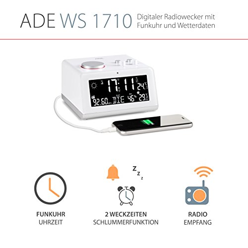 ADE-Digitaler-Radiowecker-WS-1710-mit-Funkuhr-und-Wetterdaten-Inklusive-Wettervorhersage-Innen-und-Auenthermometer-2-Weckzeiten-Snooze-LED-Display-UKW-Radio-und-Kalender-Farbe-Wei