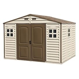 Duramax WoodSide 10 x 8 (7.64 m²) Kunststoff gerätehaus mit 3 festen Fenstern und Metallfundamentset, Gerätehaus, wartungsfreie und robuste und Dachstruktur aus Metall, Ivory/Brown
