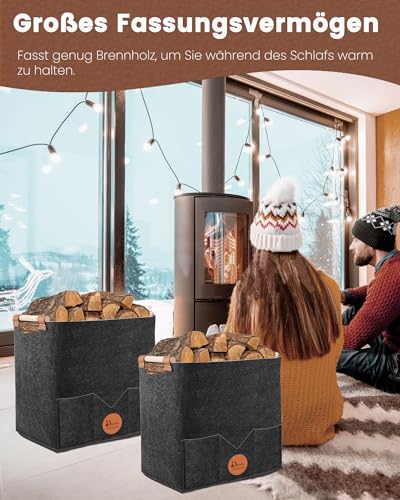 HOCHWERTIGES MATERIAL: Der Kaminholzkorb besteht komplett aus umweltfreundlichem Filz mit stabilen Nähten, um eine besonders robuste und langlebige Nutzung zu gewährleisten. Das weiche Material schont den Boden und lässt sich leicht reinigen. Unsere Filzkörbe haben Holzgriffe, die mit strapazierfähigem und tierfreundlichem Leder verstärkt sind, um ein Reißen zu verhindern und einen sicheren Transport von schwerem Brennholz oder Einkäufen zu ermöglichen.