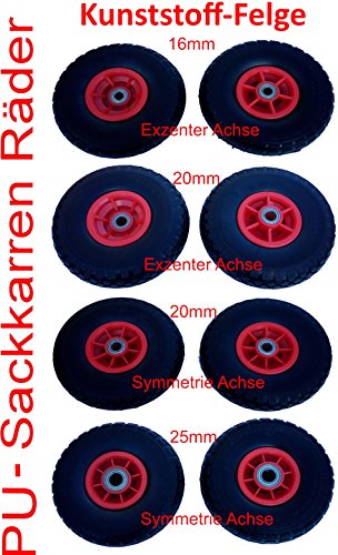 Zur Auswahl stehen 4 Varianten. Bilder bildlich darstellen alle beide Seiten des jeweiligen Rades. (1) Achsdurchmesser: 16mm Radgröße: 260 x 80mm – 4.10/3.50-4 PU Exzenter Grundlinie Achslänge: 50mm Überstand einseitig: 3mm (2) Achsdurchmesser 20mm Rad Größe: 260 x 70mm – 3.00-4 PU Exzenter Grundlinie Achslänge: 60mm Überstand einseitig: 15mm (3) Achsdurchmesser: 20mm Radgröße: 260 x 70mm – 3.00-4 PU Symmetrische Grundlinie Achslänge: 70mm Überstand beidseitig: 1mm (4) Achsdurchmesser: 25mm Radgröße: 260 x 80mm – 4.10/3.50-4 PU Symmetrische Grundlinie Achslänge: 75mm Überstand beidseitig: 0mm Laufeigenschaften wie ein Luftrad Trotzdem absolut nie noch einmal einen „Platten“ !!!! 2 Pannensichere 260 mm Räder alle Polyurethan (Geschäumt). Jedes Rad besitzt eine Kunststofffelge mit 2 Carbon-Kugellager. Für allesamt Bodenbeläge sinnvoll. Traglast 180 kg Raddurchmesser 260 mm Reifenbreite 70/80 mm