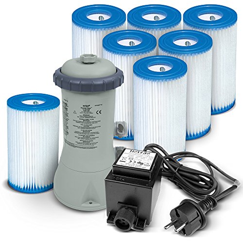 Die dem Set beigefügte Filterpumpe mit Leistungsvermögen von 2271 Liter / Stunde hilft Ihnen das Wasser in Ihrem Pool sauber und klar zu halten. Die Pumpe verfügt über einen 12 V Transformator, wodurch ist diese sonderlich hart im Nehmen und zuverlässig.