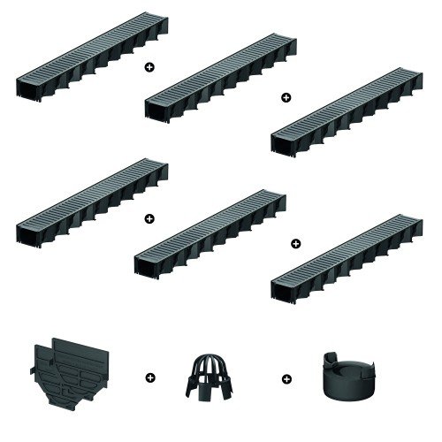 6x ACO HexaLine 2.0 Entwässerungsrinne unter Einsatz von Stahl verzinktem Rost 1 m 2x ACO Kombistirnwand 1x ACO Laubfang 1x ACO Vertikalablaufanschluss