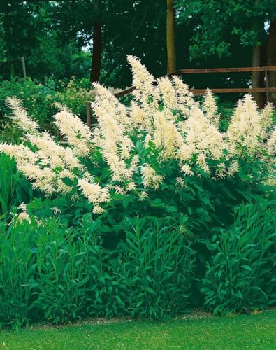 Aruncus sinensis ‚Zweiweltenkind‘ besticht dank elegante, federartige Blütenstände ebenso robustes Emporheben, folgsam an Stelle naturnahe Gärten.