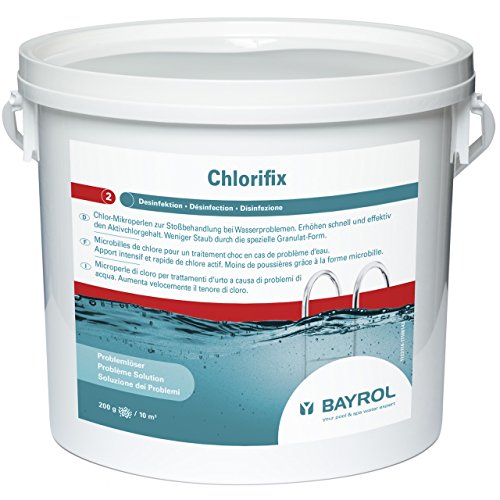 Dieses schnell lösliche Chlorgranulat Chlorifix wird zur Stoßbehandlung bei Wasserproblemen denn trübes oder veralgtes Wasser eingesetzt. Dosiert wird direkt ins Wasser. Der Aktivchlorgehalt im Wasser wird schnell und effektiv erhöht, dank des Einsatzes von ausgesprochen hochwertigem Rohmaterial. Bei herkömmlichem Chlor-Granulat entsteht Staub bei der Dosierung – nicht bei Chlorifix. Durch die spezielle Darreichung in Form von Mirkoperlen wird dies verhindert.