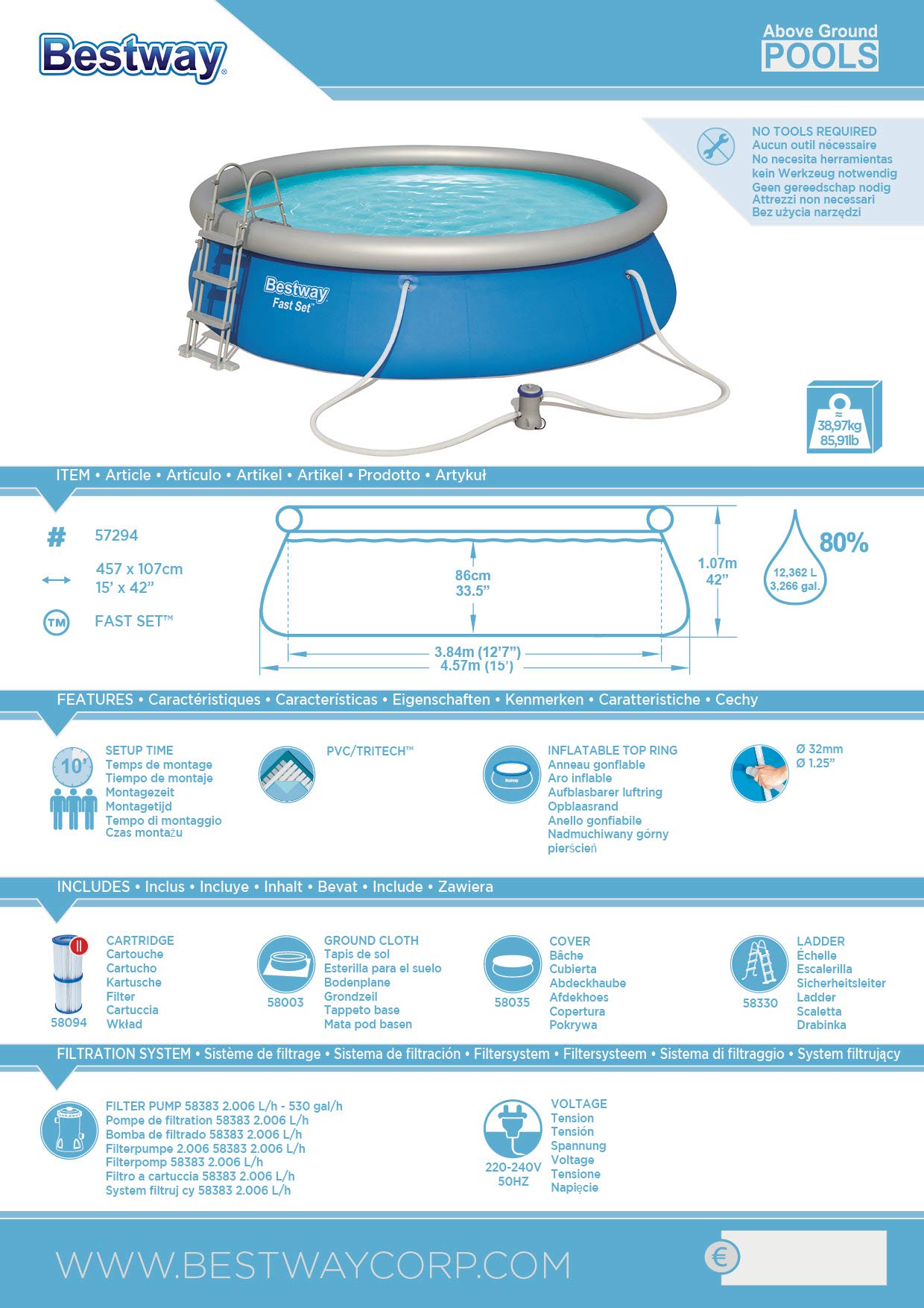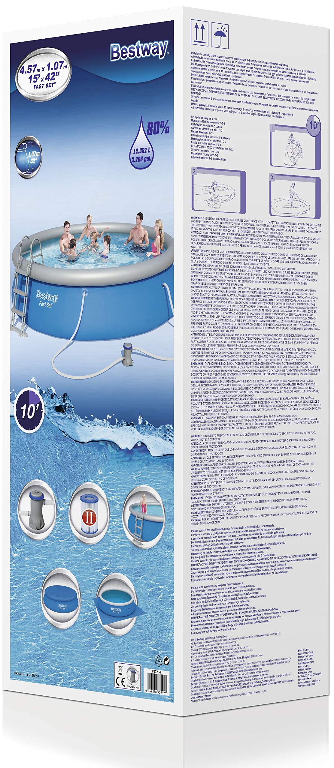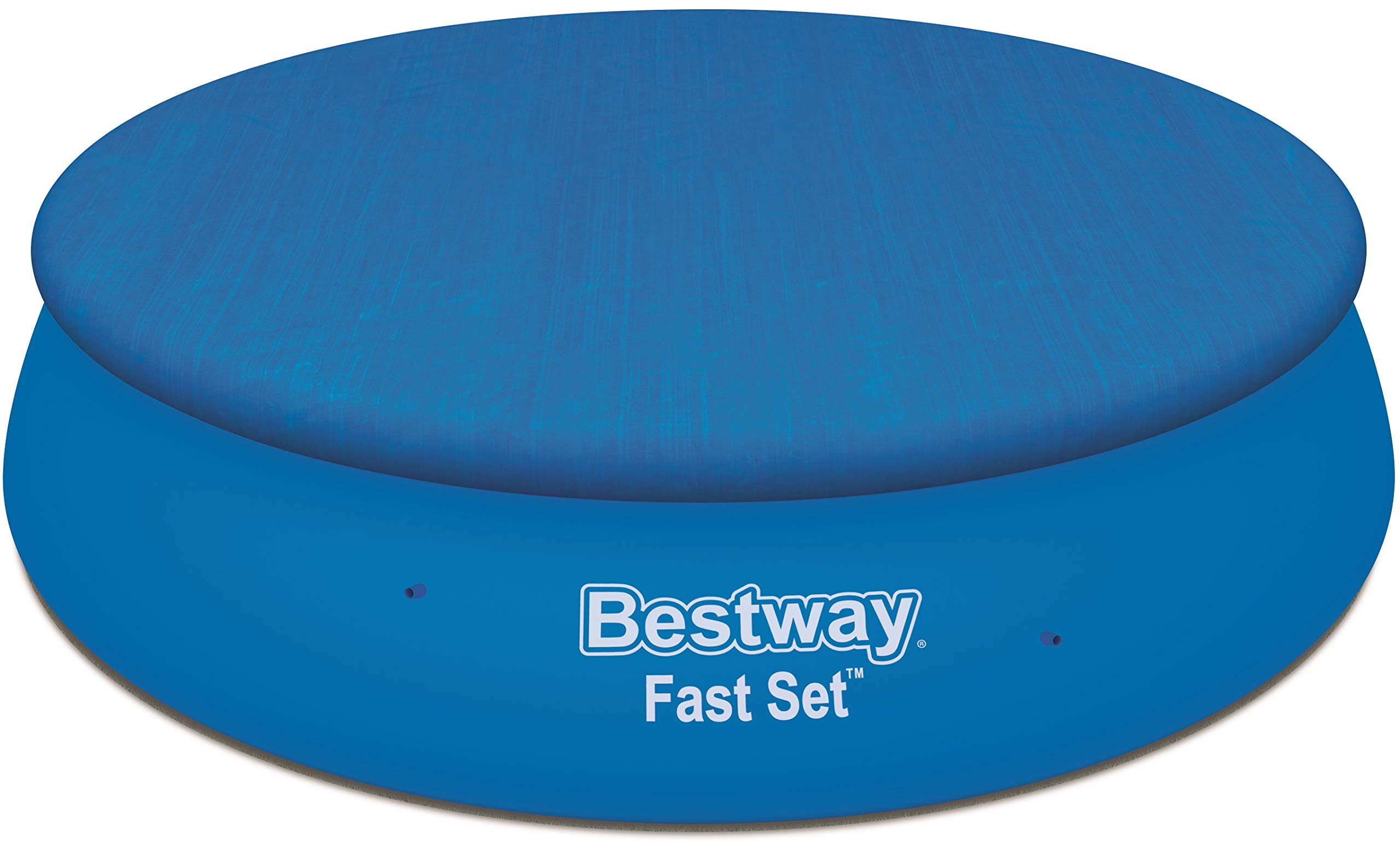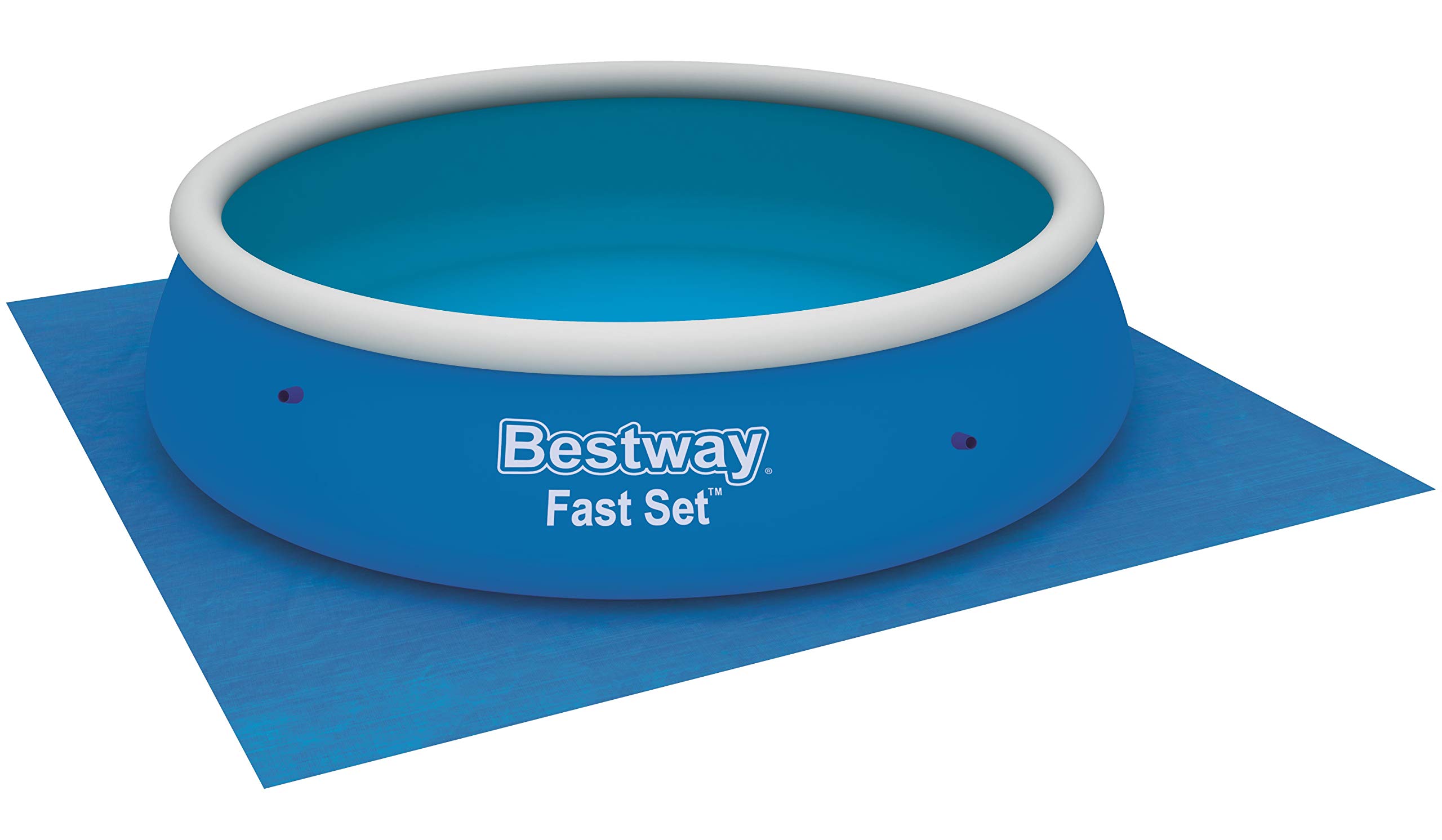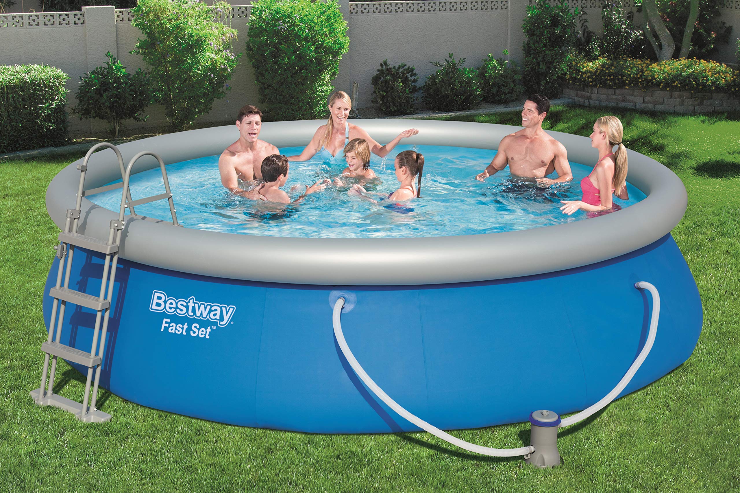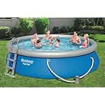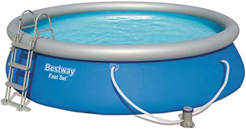 Lieferumfang – Bestway Fast Set Pool, Filterpumpe, Filterkartusche, Sicherheitsleiter, Abdeckplane, Bodenplane und selbstklebendem Unterwasser-Reparaturflicken, Material: TriTech, Farbe: blau