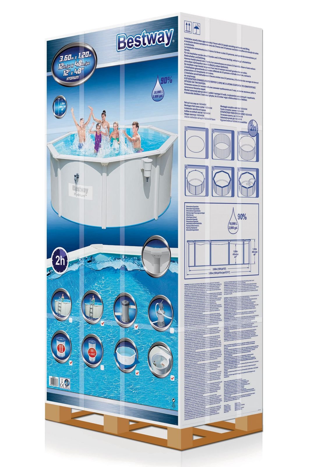 Wasserkapazität zu 90% gefüllt: 10.990 Liter; Durchmesser 360 x 120 cm