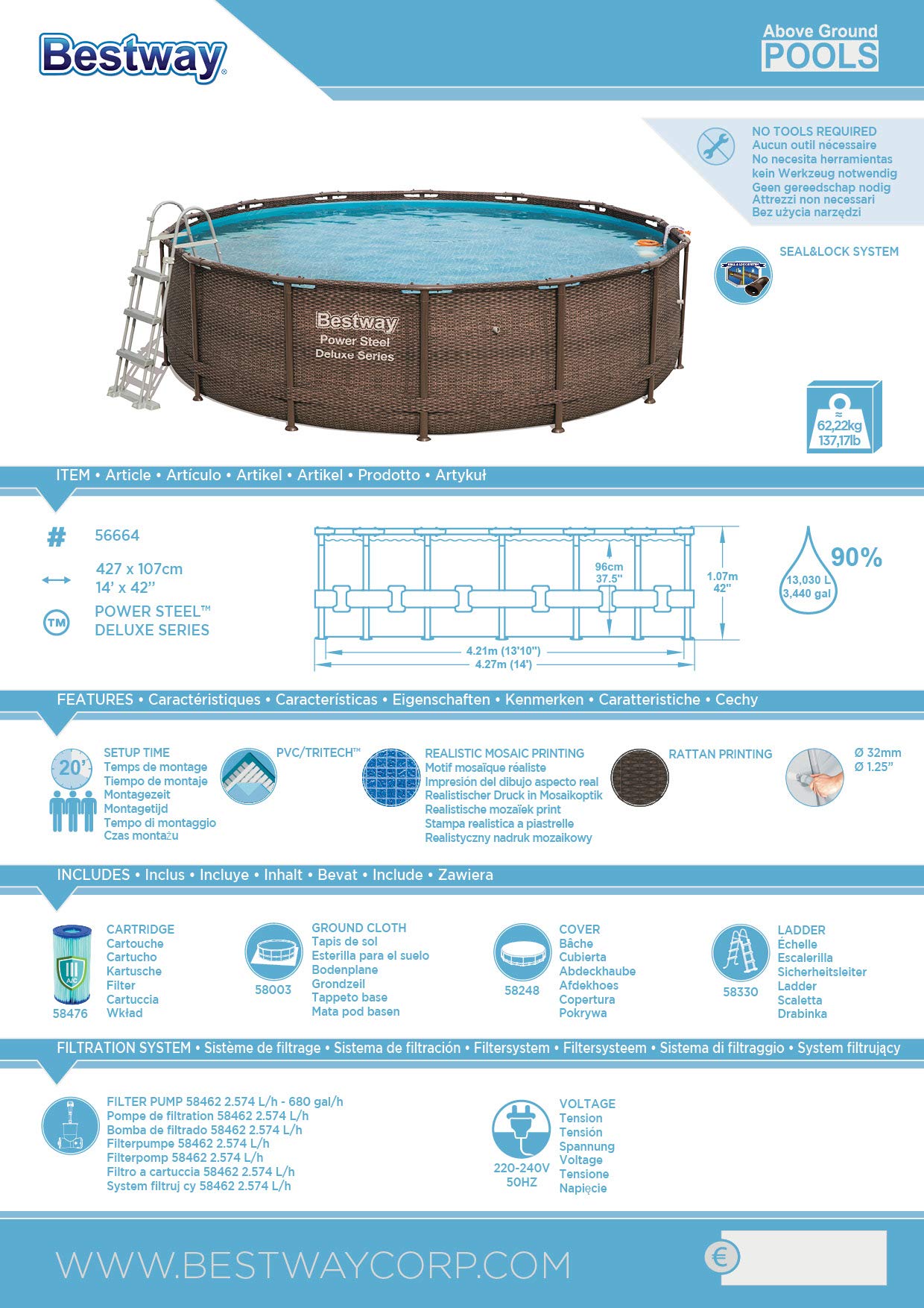Größe: D 427 x 107 cm, Wasserkapazität zu 90% gefüllt: 13.030 Liter