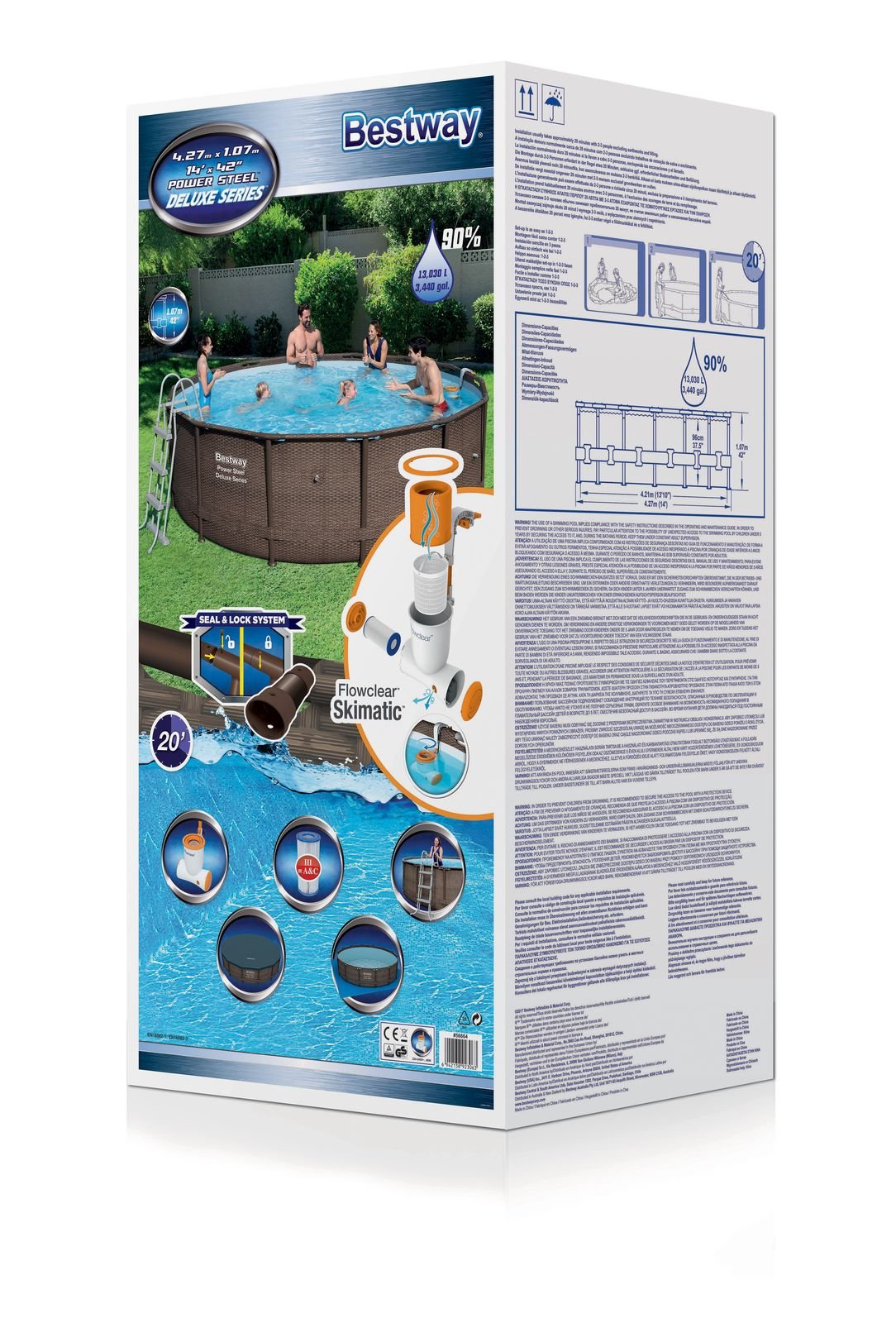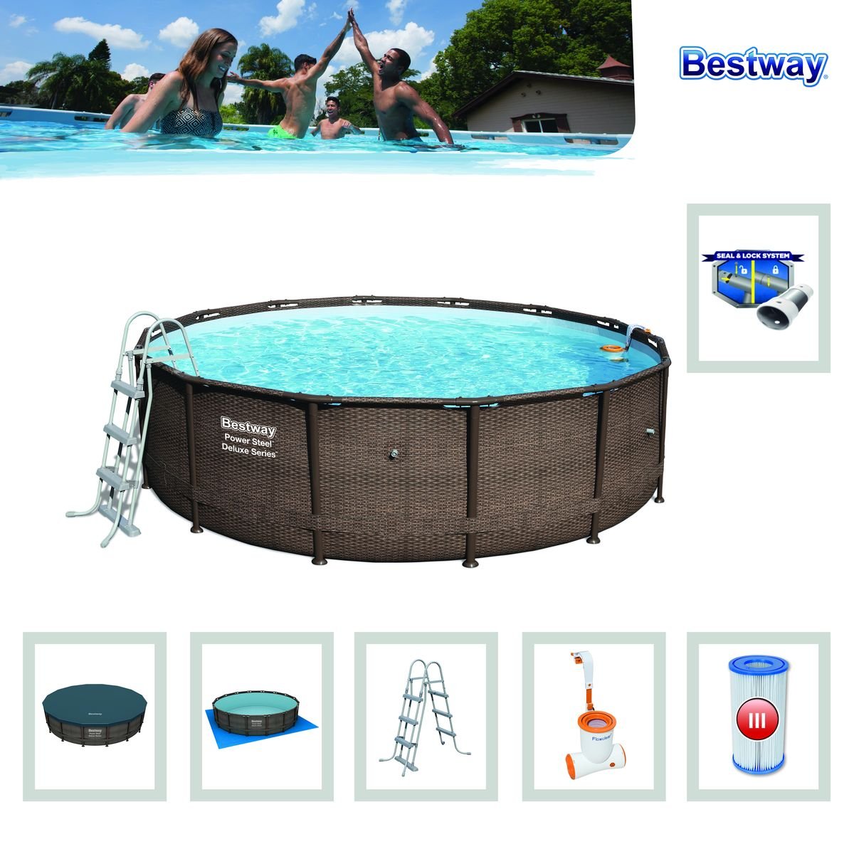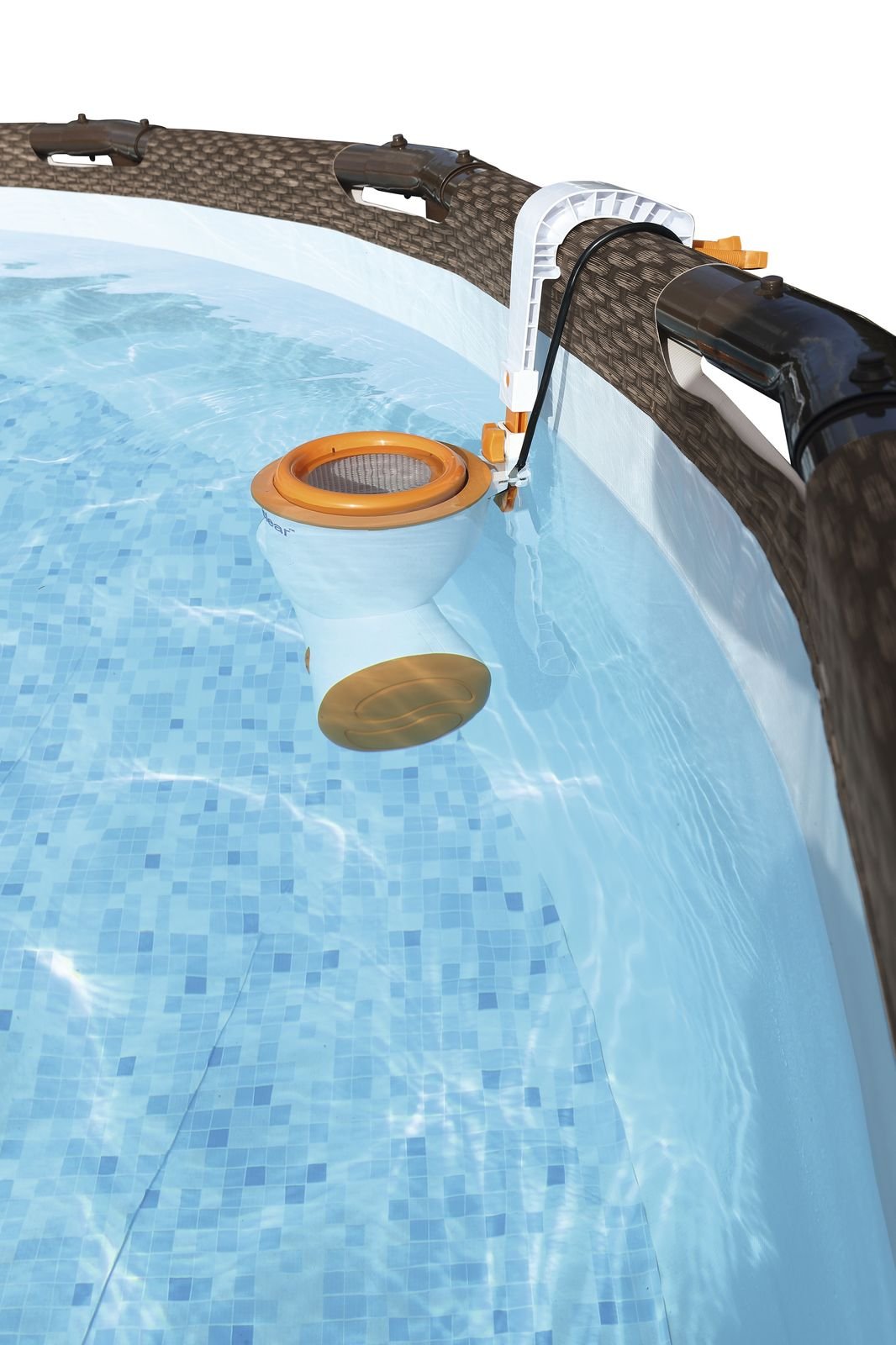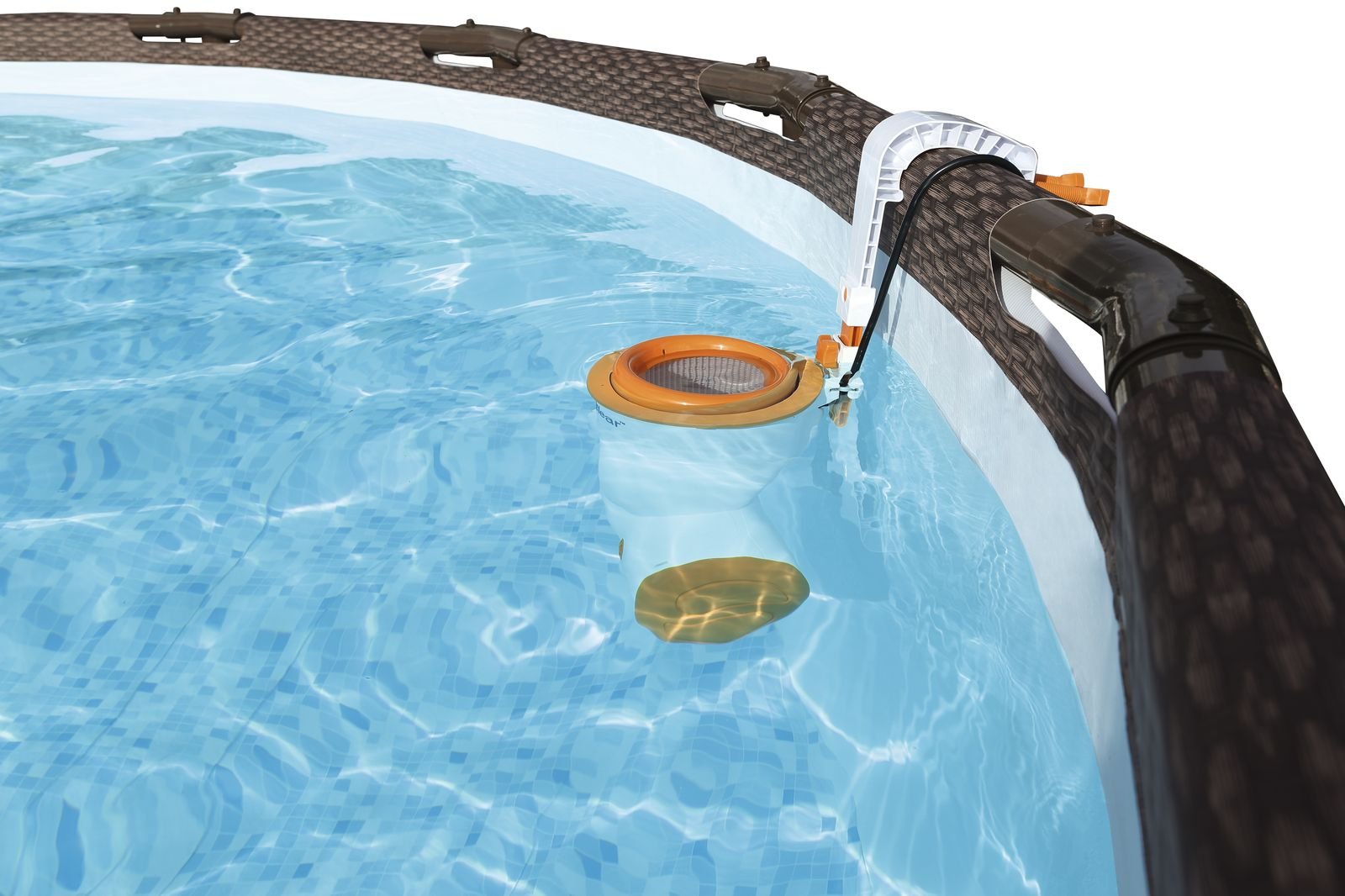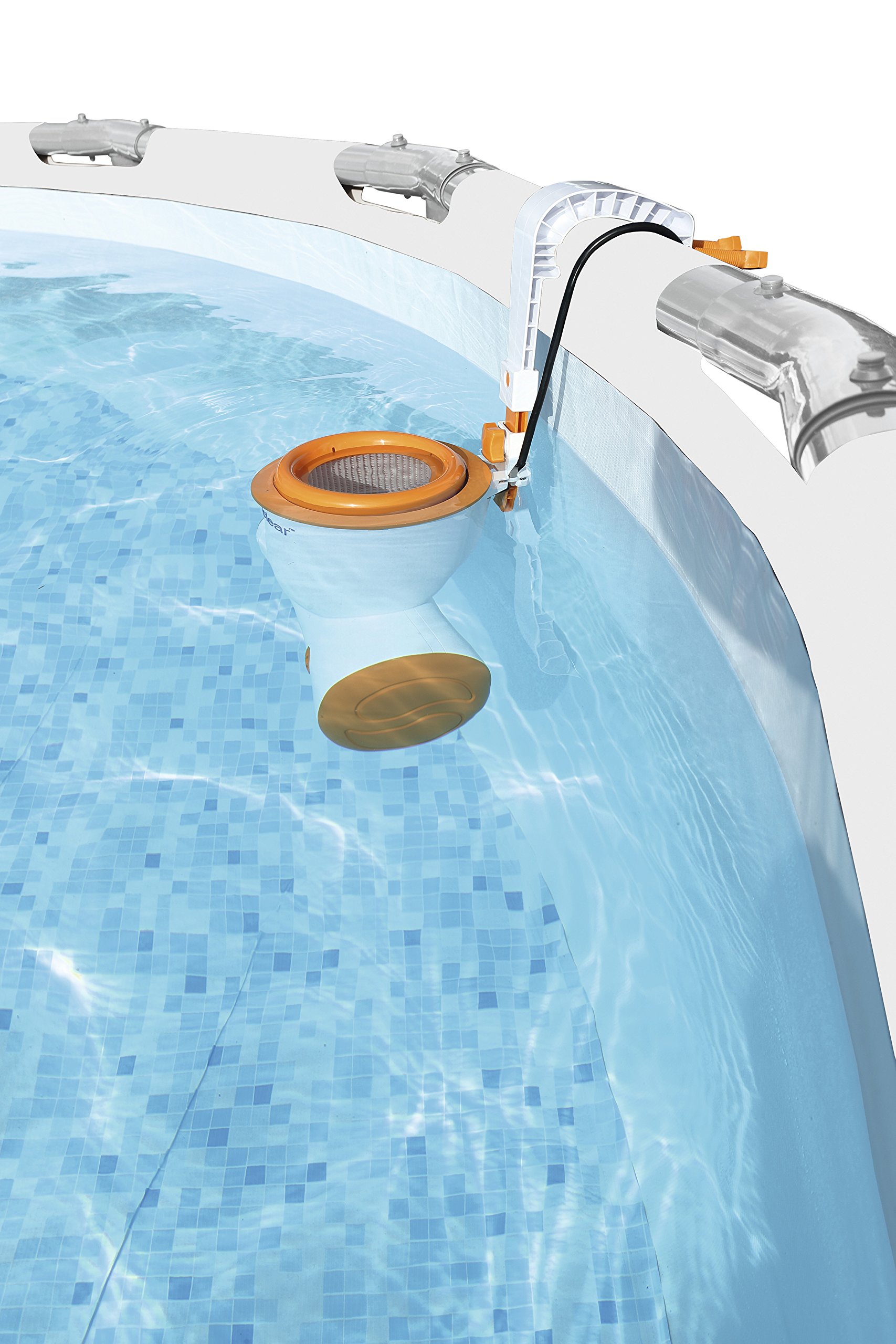 Gesamtinhalt: ein Pool, eine Flowclear Skimatic Filterpumpe, eine Sicherheitsleiter, eine Bodenplane, eine Abdeckplane