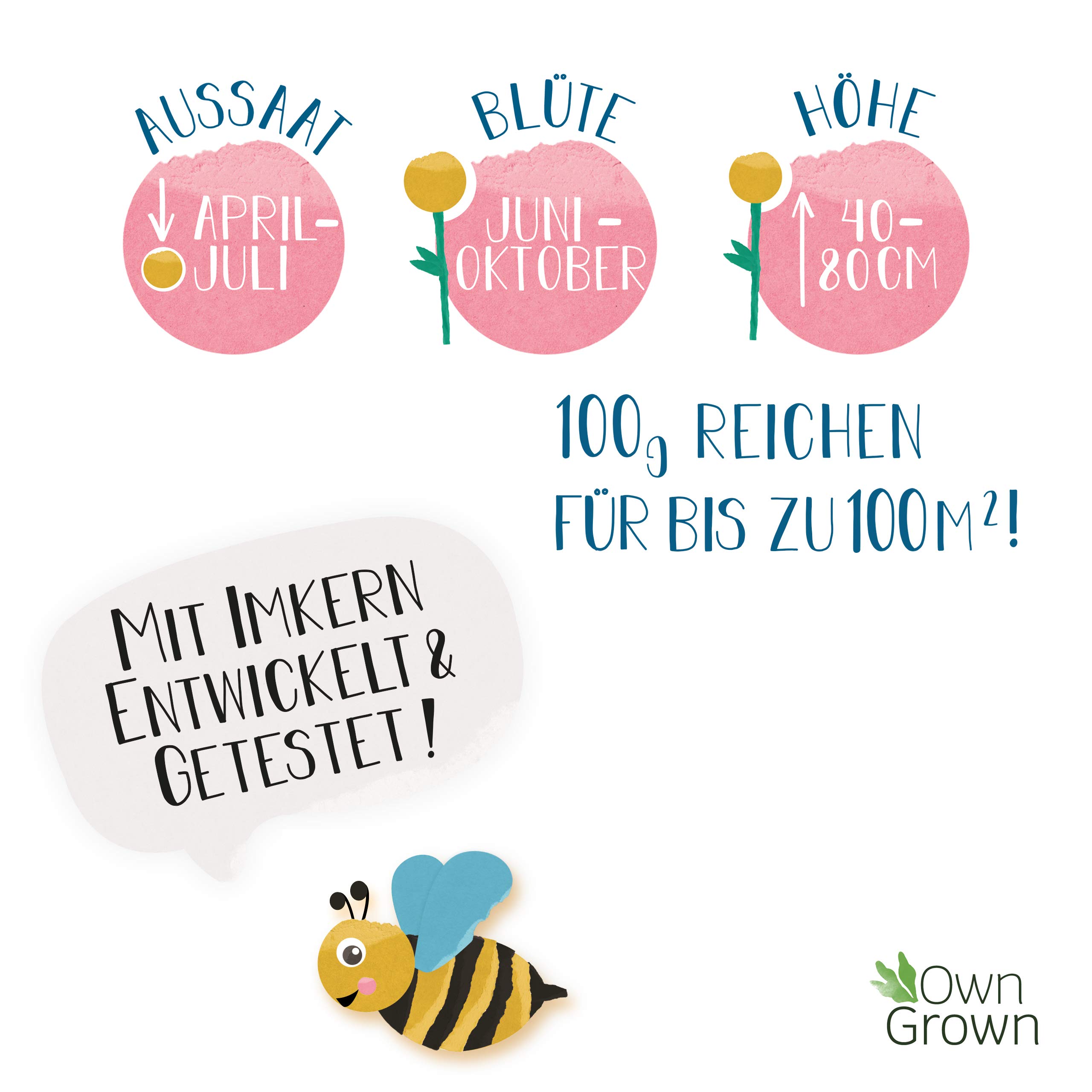 🌼 Das Bienensaatgut in Maßen an Stelle 50-100 qm Anhand Bienenblumen (bitte weitwürfig aussähen). Aussat der Saatgut ab vierter Monat des Jahres, Blüte Juni bis Okt., Wuchshöhe der Bienen Blumen 40-80 cm. Blüten auf keinen Fall sicheln!