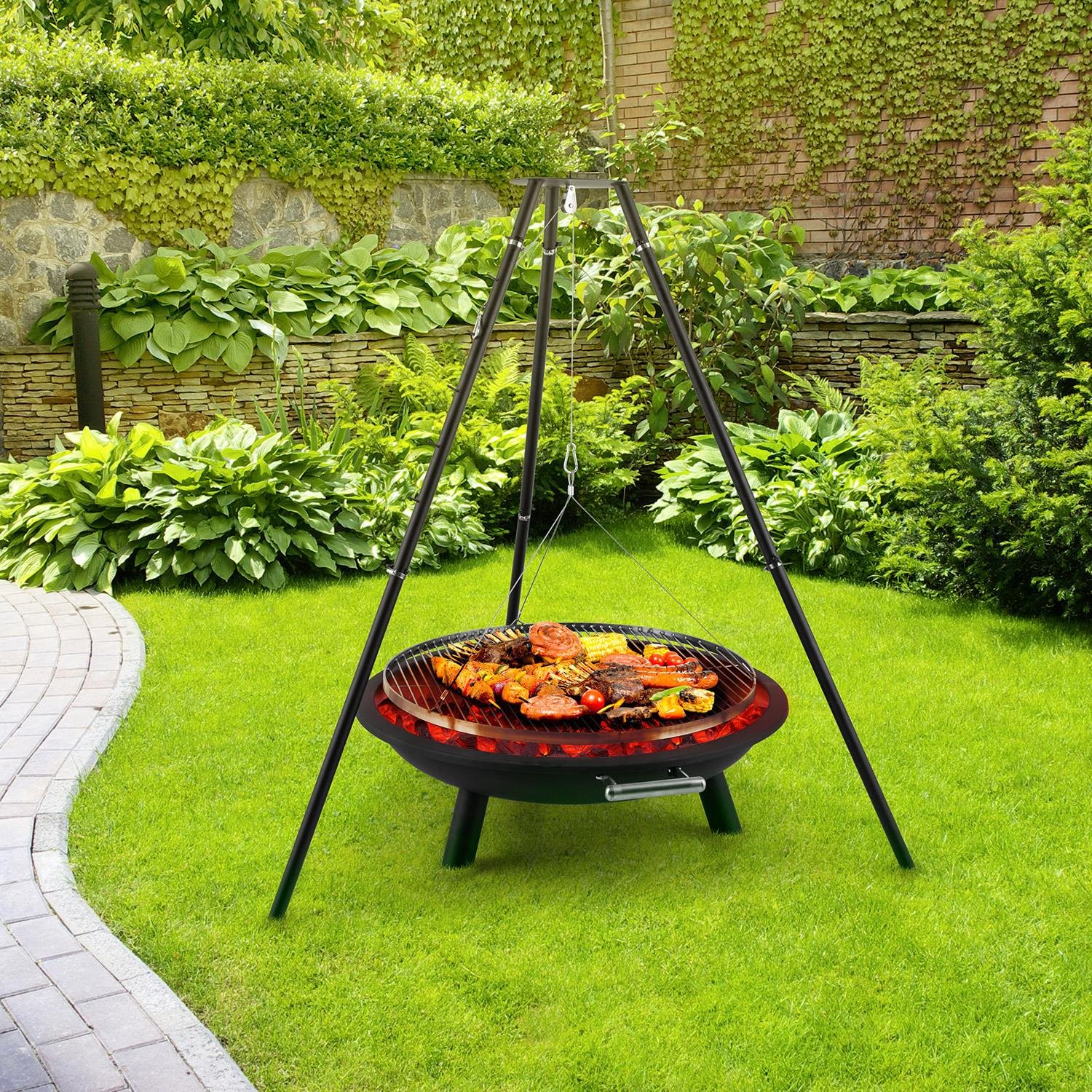 PRAKTISCH: Der 70cm durchmessende Grillrost des Schwenkgrills kann sich frei über dem Feuer drehen, wodurch das Anbrennen des Grillguts stark verringert wird. Über einen Seilzug lässt sich der Abstand der Grillfläche zum Feuer regulieren.