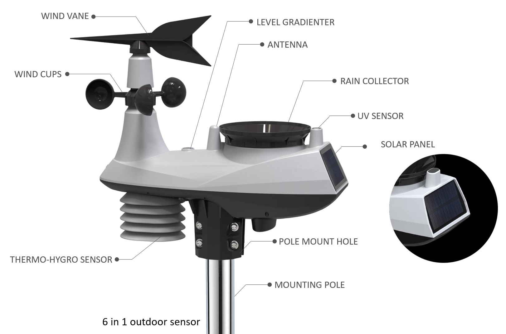 Der 6-in-1 Außensensor zeigt Ihnen aktuelle Datensammlung mit Hilfe von die Temperatur, die Luftfeuchtigkeit, den atmosphärischer Druck, die Windgeschwindigkeit weiterhin Windrichtung, sowie die Niederschlagsmenge weiterhin die UV-Strahlung inklusive Solarpanel.