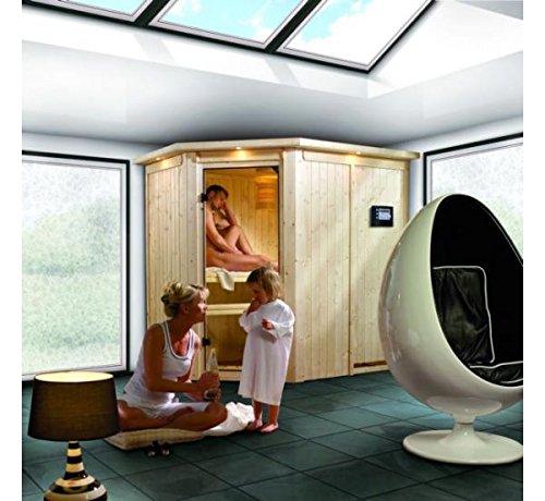 Produkteigenschaften Karibu Elementsauna Carin 68 mm inkl. 9-kW-Bioofen mit externer Steuerung: Wände: Die Wandelemente der Karibu Elementsauna bestehen nicht mehr da einer 68 mm starken, stabilen Konstruktion. Durch diese Bauweise wird ein einfacher Aufbau der Systemsauna garantiert es sorgt für eine hohe Stabilität. Die Wandelemente bestehen nicht mehr da einer stabilen Rahmenkonstruktion mit zwischengelagerter 42 mm starker Mineralwolldämmung. Die Innenseiten bestehen nicht mehr da 12,5 mm starkem Spezial-Fichte-Profilholz. Dieser Aufbau grantiert eine optimale, saunagerechte Abkapselung. Die sichtbaren Außenseiten sind ebenfalls mit Profilholz verkleidet. Die nicht sichtbaren Seiten sind mit einer Hartfaserplatte verstärkt und weisen eine Gesamtstärke von 57 mm auf. Dach: Die Dachelemente der Karibu Elementsauna sind angrenzend zu den Wandelementen aufgebaut und bestehen nicht mehr da einer stabilen 57 mm starken Konstruktion. Durch diese Bauweise wird ein einfacher und schneller des Daches garantiert es sorgt für eine hohe Stabilität. Die