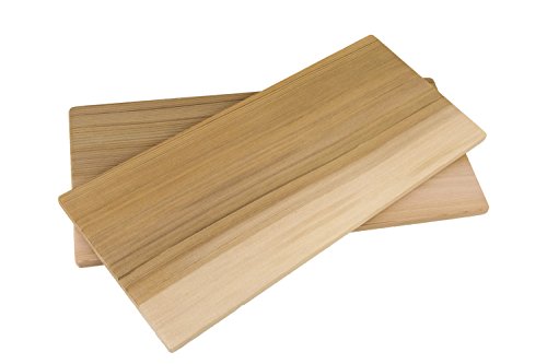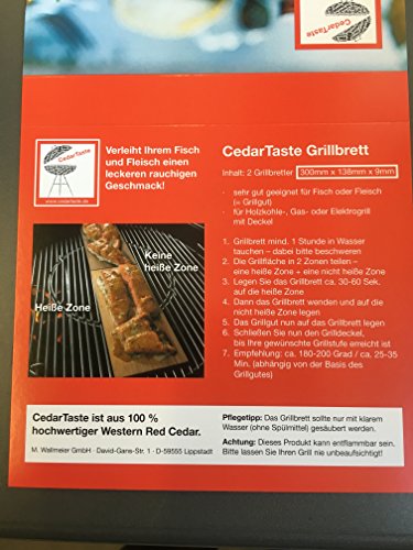 Enthält 2 hochwertige Grillbretter aus 100% nordamerikanischer Western Red Cedar. Größe je Grillbrett: 300 x 138 x 9 mm (KEINE Zeder aus Asien !)