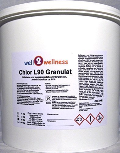 Chlor L 90 Granulat – Anwendungsbereich: Das kalkfreie + langsamlösliche Chlorgranulat wirkt über längere Zeit gegen Bakterien, Viren und Pilze im Schwimmbadwasser und baut organische Trübstoffe und Verunreinigungen ab. Chlor L 90 Granulat ist bei allen Wasserhärten einsetzbar, löst sich rückstandsfrei auf und führt nicht zu Ablagerungen oder verstopften Durchsieben. Vorteile: – Granulat mit sehr hoher Leistungsreserve – sehr hoher Lebhaft-Chlorgehalt (90%) – kalkfrei und pH-neutral – langsam und rückstandsfrei löslich, keine verstopften Dosierleitungen und Filter – bei jeder Wasserhärte einsetzbar – stabilisierende Wirkung auf freies Chlor im Wasser (verhindert zu raschen Chlorabbau bei höheren Wassertemperaturen und starker Sonneneinstrahlung). Anwendungsempfehlung: Voraussetzung für eine wirksame Chlorung ist das Umstellung des pH-Wertes auf 7,0 – 7,4 mit pH-Abzüglich oder pH-Plus. Erstzugabe: Das Granulat sollte vor Anwendung in einem Eimer mit Wasser voraufgelöst werden und im Ausschnitt der Einlaufdüse(n) dem Beckenwasser kritisch dessen ungeachtet werden! ACHTUNG: Immer Schutzbrille versteifen! 200 g pro 50 m³ Beckeninhalt sowie 2 schnelllösliche Chlortabletten a 20g pro 10 m³ (über Dosierschwimmer) – Wöchentliche Nachdosierung: ca. 200 g pro 50 m³ Beckeninhalt. / Kontrolle: Der mindestens einmal pro Woche gemessene Chlorwert soll zwischen 0,3 und 0,6 mg/l liegen. Wichtiger Hinweis: Wegen Gefahr von Bleichflecken Chlor L 90 Granulat nicht direkt ins Becken werfen bzw. in direkten Kontakt mit chlorunbeständigen Werkstoffen bringen, sondern immerhin voraufgelöst am Beckenzulauf (Einlaufdüse) kritisch dem Beckenwasser beifügen.