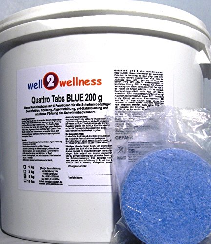 Multitabs Blue 5 in 1 200g — Kombitabletten mit 5+ Funktionen für die einfache Schwimmbad – Komplettpflege: Desinfektion, Flockung, Algenverhütung, pH-Stabilisierung, Klareffekt + azurblaue Färbung des Schwimmbadwassers. — Anwendungsbereich: Die Multitabs Blue sind die komplette Schwimmbadwasserpflege für die Dauerdesinfektion, Algenverhütung, Flockung (bei Sandfiltern), pH-Stabilisierung + Klareffekt. Die Multitabs tätig sein über lange Zeit (bis zu 14 Tage) gegen Bakterien, Viren, Pilze, Algenwachstum und Trübungen. Multitabs Blue sind bei allen Wasserhärten einsetzbar, losschnallen sich rückstandsfrei auf und führen nicht zu Ablagerungen oder verstopften Sieben. Vorteile: – bequeme Komplettpflege für Desinfektion, Algenverhütung, Flockung, pH-Stabilisierung und kristallklarem Wasser / – azurblaues + kristallklares Wasser / – bereits vorportioniert für gut 50 m³ Wasser / – saubere Dosierung mit einem Handgriff, einfach in einen Dosierschwimmer geben, kein langes Erheben und Hantieren / – hält doppelt so lange wie üblich (bis zu 14 Tage) / – ideale Urlaubspflege, hält bei reduzierten Filterlaufzeiten bis zu 3 Wochen / – besonders langsam und rückstandsfrei löslich. Anwendungsempfehlung: Voraussetzung für eine wirksame Wasserdesinfektion, Algenverhütung und Flockung ist das Justierung des pH-Wertes auf 7,0 – 7,4 mit pH-Abzgl. oder pH-Plus. Zugabe: 1 Multitabs Blue 200g je 50 m³ Beckeninhalt ca. alle 10 – 14 Tage dem Beckenwasser über einen Dosierschwimmer / Tablettenboje oder über den Skimmer zusammenrechnen. Wichtige Hinweise: Wegen Gefahr von Bleichflecken die Multitabs nicht ins Becken werfen bzw. in direkten Kontakt mit chlorbeständigen Werkstoffen bringen. Sollte aufgrund von längerer Mangel oder zu geringer Dosierung bzw. zu starker Belastung das Schwimmbadwasser trüb geworden sein, kann jederzeit eine Stoßchlorung (z.B. mit Chlor S Granulat oder Chlor S Tabletten) durchgeführt werden.