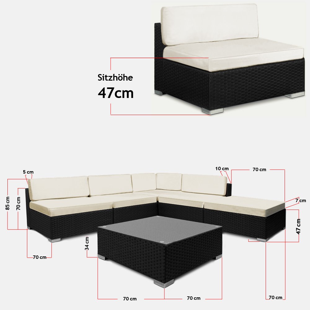 Maße Möbel-Set: (LxBxH) 210 x 210 x 70 cm Maße Sitzelement: (LxBxH) 70 x 70 x 70 cm Maße Einzelsitzelement: (LxBxH) 70 x 70 x 40 cm Maße Tisch: (LxBxH) 70 x 70 x 43 cm Sitzhöhe: 47 cm (Spelunke Kissen: 40 cm) Material Kissen: 100% Polyester Material Sofa: Polyrattan