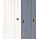 Unter Einsatz von drei Regalböden drin u. a. 3-fach-Hakenleiste draußen – Ganz Arbeitsgeräte praktikabel verstauen