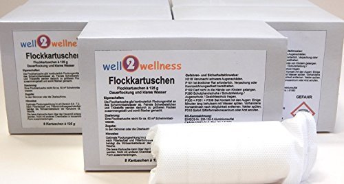 Superflock Kartuschen 10 kg (80 Kartuschen a 125 g) — Eigenschaften: Die Flockkartusche gibt unabänderlich Flockmittel an das Schwimmbadwasser ab. Feinste Schwebeteilchen und Trübstoffe werden demzufolge zu großen Flocken angesammelt und folglich filtrierbar gemacht! Das Einstellung ist kristallklares Schwimmbadwasser! Dosierung: Eine Flockkartusche reicht für ca. 50 m³ Schwimmbadwasser für ca. 1 Woche. Zugabe: Einfach in den Skimmer oder in die Überlaufrinne legen. Zu keiner Zeit direkt ins Becken werfen! Wichtige Hinweise: Optimale Flockungswirkung im pH-Stufe 6,8 – 7,2. Je nach Filterlaufzeit und Filterdurchflussgeschwindigkeit beträgt die Wirksamkeitsdauer ca. 1 Woche. Die leere Kartusche kann über den Hausmüll entsorgt werden. Nicht mit anderen Chemikalien in konzentrierter Form zusammenbringen. Vorsicht: Doch bei Schwimmbecken mit Sandfilteranlagen verwenden!