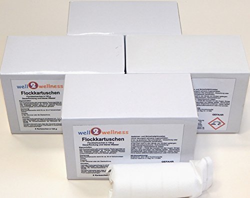 Superflock Kartuschen 4,0 kg (32 Kartuschen a 125 g) — Eigenschaften: Die Flockkartusche gibt unabänderlich Flockmittel an das Schwimmbadwasser ab. Feinste Schwebeteilchen und Trübstoffe werden somit zu großen Flocken aggregiert und demzufolge filtrierbar gemacht! Das Ziel ist kristallklares Schwimmbadwasser! Dosierung: Eine Flockkartusche reicht für ca. 50 m³ Schwimmbadwasser für ca. 1 Woche. Zugabe: Einfach in den Skimmer oder in die Überlaufrinne legen. Absolut nie direkt ins Becken werfen! Wichtige Hinweise: Optimale Flockungswirkung im pH-Stück 6,8 – 7,2. Je nach Filterlaufzeit und Filterdurchflussgeschwindigkeit beträgt die Wirksamkeitsdauer ca. 1 Woche. Die leere Kartusche kann über den Hausmüll entsorgt werden. Nicht mit anderen Chemikalien in konzentrierter Form zusammenbringen. Augenmerk: Dessen ungeachtet bei Schwimmbecken mit Sandfilteranlagen verwenden!