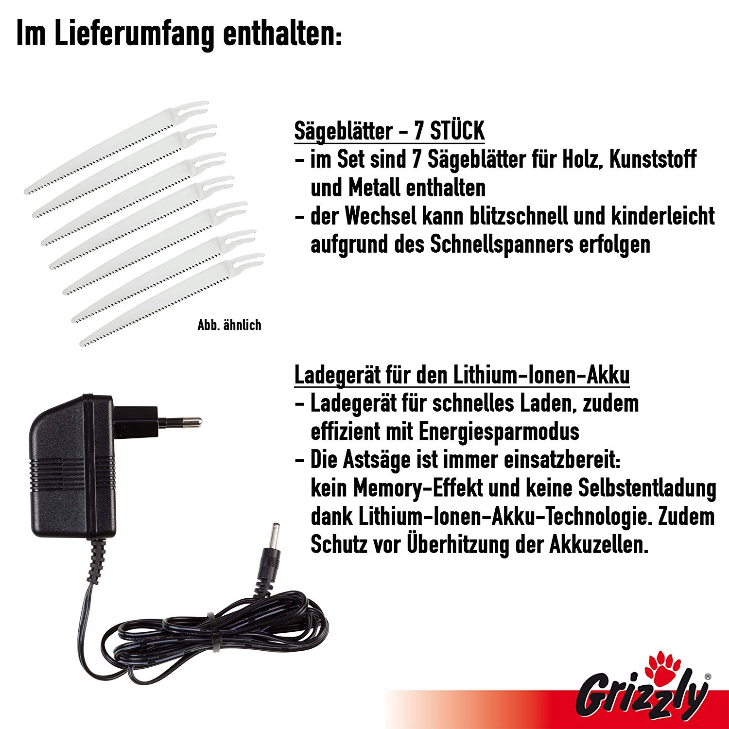 inbegriffen 7 Sägeblätter: 3x Tann, 2x Kunstoff, 2x Metall