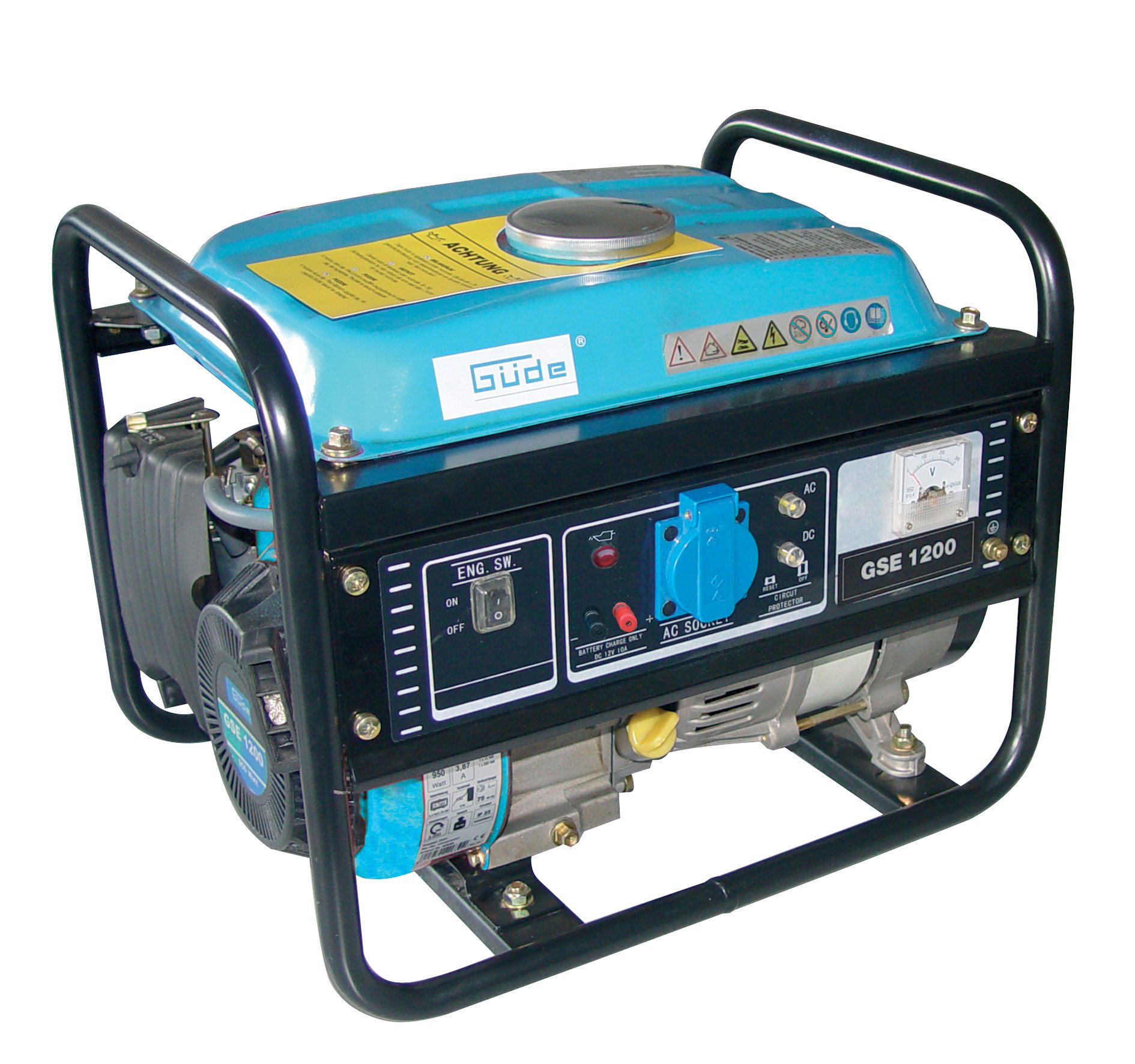 Güde 4-Taktsignal Synchrongenerator , Überlastungsschutz, Ölmangelsicherung des Weiteren Tragerahmen. über Reversierstarter. Technische Aussagen Motorleistung: 2 kW / 2,8 PS daneben 3800 wenigstens1 Hubraum: 82 ccm Motortyp: 4-Taktsignal-OHV, luftgekühlt Knotenpunkt: 1 x 12 Vanadium/1 x 230 Vanadium Schutzart: IP 23 Nennleistung: 950 Wolfram/1200 VA Dauerleistung: 850 Wolfram/1000 VA Tankinhalt: 5 l Abschleifung daneben Halblast: 0,75 l/h Lärmwertangabe: LWA 95 dB Ballast: 26 kg