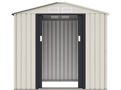 Metall-Gartenhaus „Nebraska“ – 2.70 M² – Abmessungen: 127 x 213 x 195 cm – Beige/Anthrazitgrau – Struktur: Metall (Zink) – Außenmaße: 117 x 203 x 195 cm- Innenmaße: 113 x 199 x 195 cm – 2 Schiebetüren mit Griffen (Maße: 96 x 162 cm) – 4 Entlüftungsöffnungen – Inklusive Betonverankerungsset – 4 Verstärkungsstangen – UV-beständig – Rostschutz