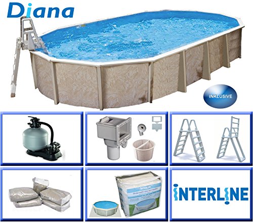 Komplettset über Datenbasis Liner, Grund Vlies, Sandfilteranlage, Saug-Poolpumpe, Filtersand, Skimmer weiterhin Kunststoff A- Frame Badeleiter
