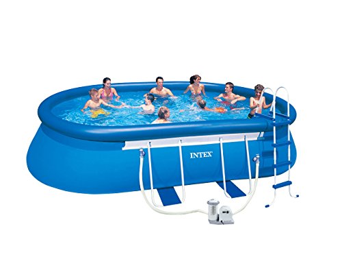 Intex Frame Pool Set, oval, 610x366x122cm, blau Beinhaltet Pool, 12V Filterpumpe, Sicherheitsleiter, Grundkleit und Abdeckung Aufgebaut in 30 Minuten