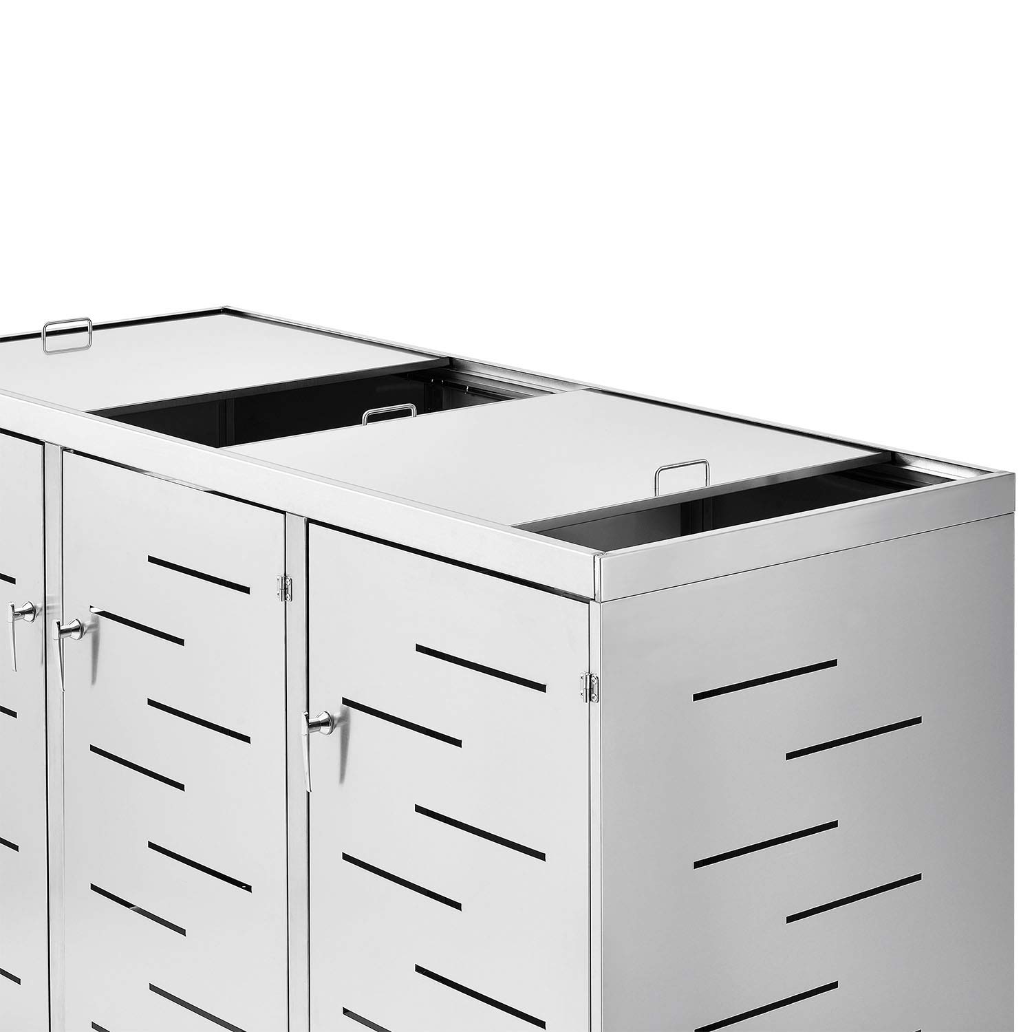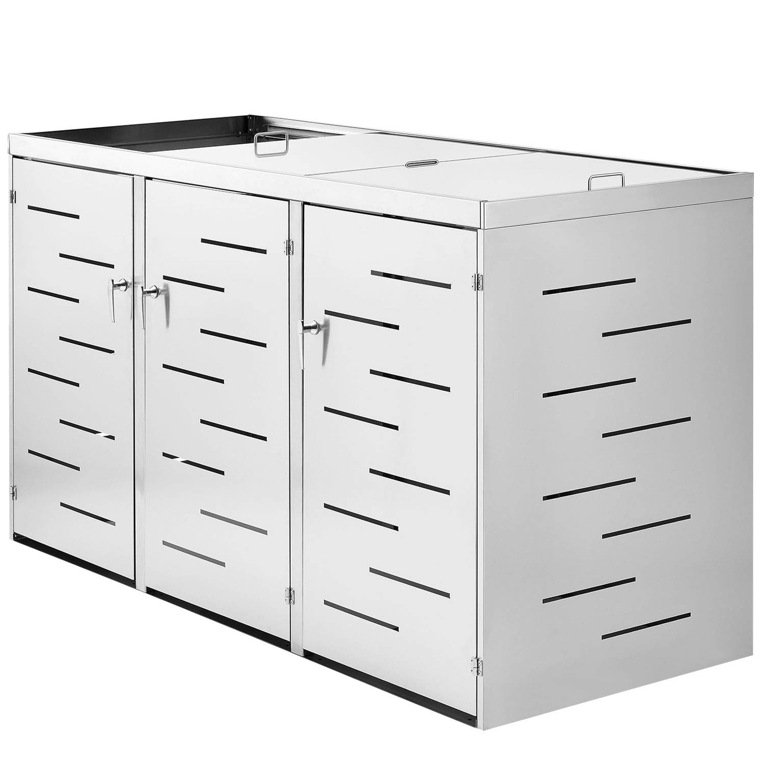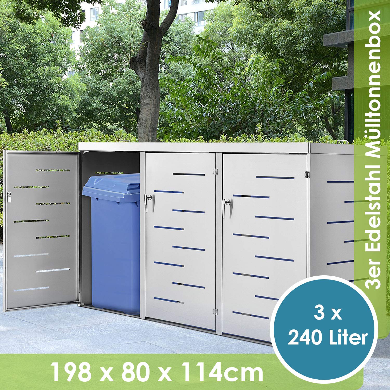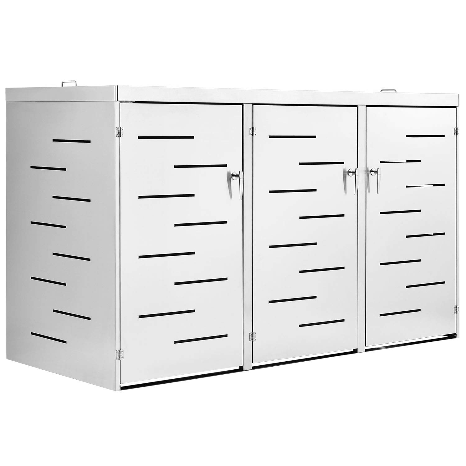Unter Einsatz von welcher praktischen 3-er rostfreier Stahl Mülltonnenbox „Arel“ Unter Einsatz von Schiebedach unter anderem verschließbaren Türen von Juskys beziehen Solche die ideale Schalung Statt die Verwahrung Ihrer Mülltonnen. Solche bietet Bezirk Statt drei 240 Liter große Mistkübel. So lassen einander Restmüll, Biotonne oder alternative Abfalltonne außerhalb Erhalten. Gefertigt ganz pflegeleichtem rostfreier Stahl ist welcher Mülltonnenschuppen sonderlich wetterfest unter anderem langlebig. Dekorative Lüftungsschlitze umsorgen ständige Luftzirkulation.