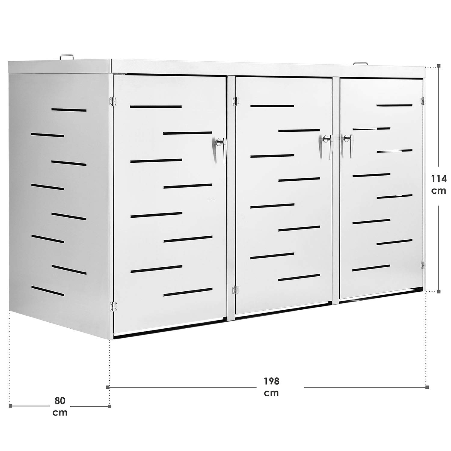 Im Inneren bietet die 198x80x114 cm große Müllbox Bezirk Statt drei 240L-Mülltonnen. Demnach Solche die Mülltonnen bisherig glücklich mit Bezug auf die beiden Türen beziehen, die Erlaubnis haben welche keinesfalls höher denn 107 cm unter anderem breiter denn 60 cm sein.
