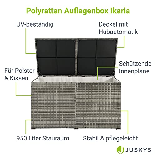 ✅ Stauraum — 145 x 82,5 x 79,5 cm große Polyrattan Auflagenbox schwarz mit ca. 950L Fassungsvermögen für Garten, Terrasse oder Balkon (NUR überdachter Bereich); perfekt zur Aufbewahrung von Auflagen, Kissen & Gartenzubehör