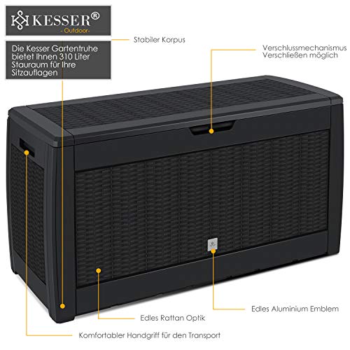 Die Auflagenbox von KESSER bietet mit einem Fassungsvermögen von 310 Liter ausreichend Platz zur Aufbewahrung von Sitzauflagen, Kissen, Auflagen und andere Gartenartikel oder Geräte