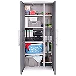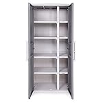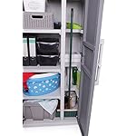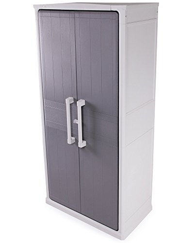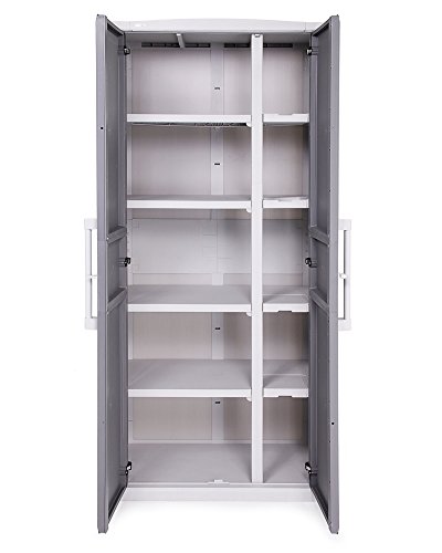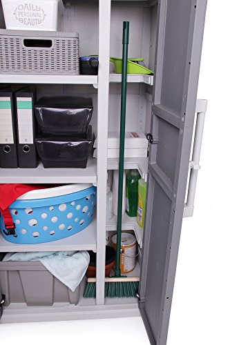 Ob Sie nun Haushaltsgegenstände lagern oder Gartengeräte verstauen wollen: Dieser Schrank ist sowohl drinnen als auch draußen Ihr idealer Begleiter. Sie brauchen Fächer unterschiedlicher Größe? Kein Problem! Durch die vier in der Höhe verstellbaren Tablare und dem herausnehmbaren Ablagebehältern sorgen wir dafür, dass Sie Ihren Mehrzweckschrank genau nach Ihren Bedürfnissen aufbauen und nutzen können. Die beiden strukturierten Griffe fühlen sich sehr angenehm an und machen zudem auch optisch etwas her. Praktisch sind der leicht zu reinigende, witterungsbeständige Kunststoff und die robusten Metallscharniere. So schließt dieser Universalschrank zuverlässig. Der Gartenschrank hält pro Einlage eine Belastung von 30 kg aus, während Sie den Boden mit bis zu 55 kg belasten können. Sicherheit wird durch das Vorhängeschloss (nicht im Lieferumfang) geboten, dessen Anbringung möglich aber nicht zwangsläufig notwendig ist. Außerdem ist der Schrank durch die Türdichtung vor Staub, Feuchtigkeit und Spritzwasser geschützt.