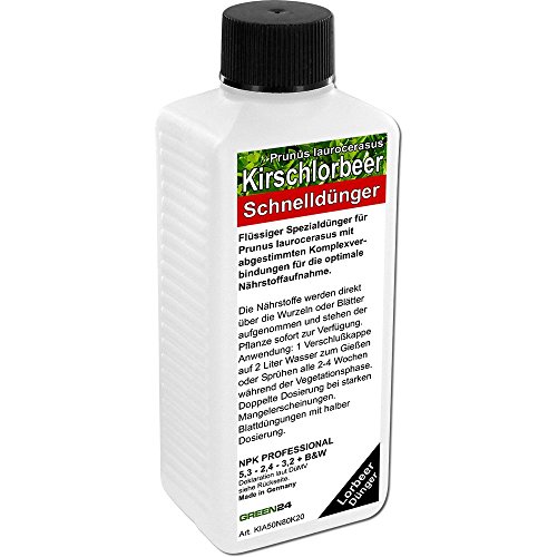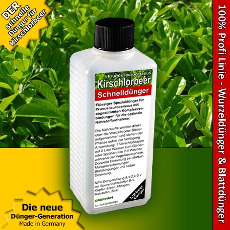 Dünger für Kirschlorbeer – Lorbeerkirsche (Prunus laurocerasus) und verwandten Arten. Optimale Nährstoffaufnahme über die Wurzeln oder Blätter.