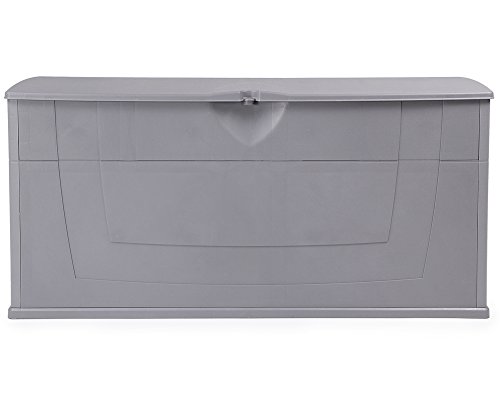 Für mehr Sicherheit können Sie die Truhe mit einem Vorhängeschloss (nicht im Lieferumfang) zu Ende bringen. Das Gewicht von trotzdem ca. 6 kg und die praktischen Griffe sorgen dafür, dass sich der Transport dieser Gartenbox einfach gestaltet und diese also flexibel einsetzbar ist. Durch den hochwertigen und wetterbeständigen Kunststoff wird keine Staunässe zugelassen und mithilfe der Belüftung für ein gutes Mikroklima gesorgt. Dessen ungeachtet ist dieses Material leicht mit einem Neutralreiniger zu säubern.