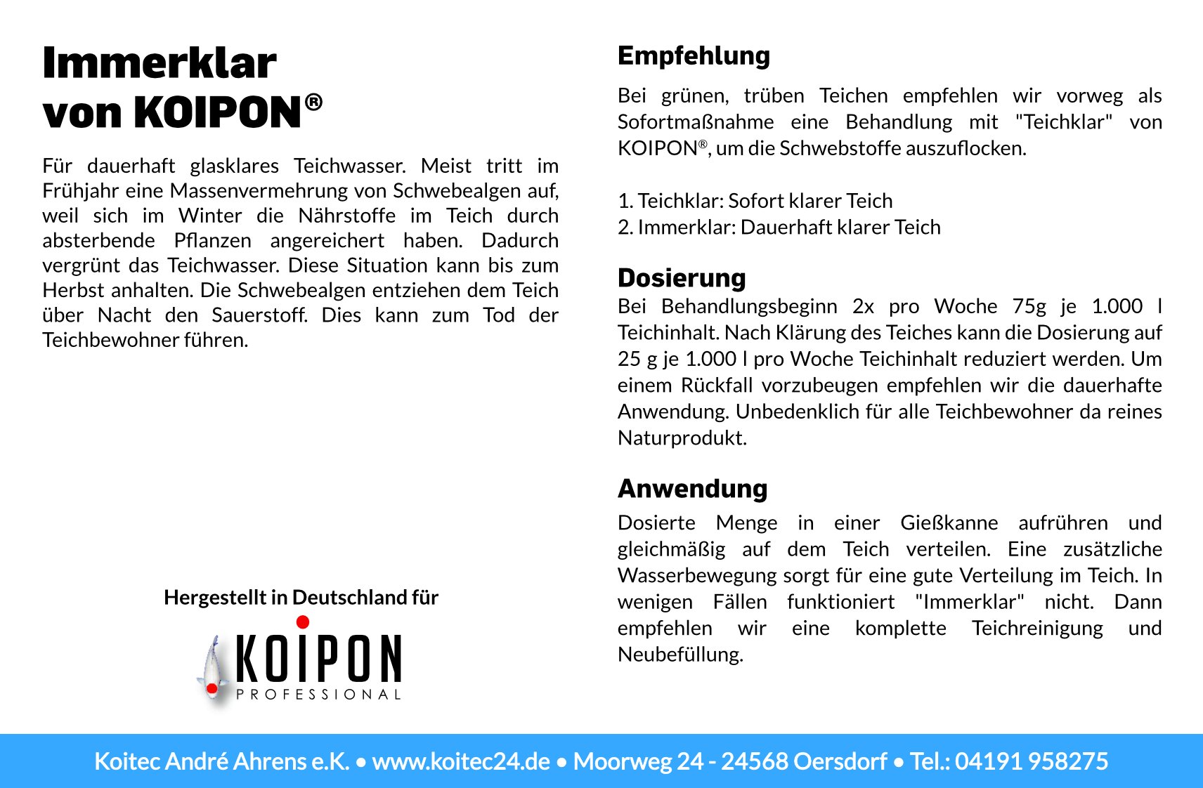 Neben dampfen, grünen Teichen empfiehlt einander im Voraus eine Therapie über Teichklar von KOIPON denn Sofortmaßnahme anstelle einen sofortigen klaren Teich, um die Schwebstoffe im Teich auszuflocken. Folgend kann Immerklar von KOIPON zur Stabilisierung Jener Wasserwerte anstelle einen nonstop klaren Teich eingesetzt werden.