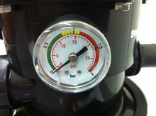 Bei Anschluss der Sandfilteranlage ohne weiterem Zubehör, qua z.B. Solarkollektoren, beträgt der durchschnittlichen Standard-Betriebsdruck 0,4 bar (entspricht 4 m Wasserhöhe).