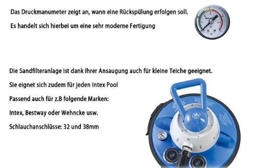 Leistung daneben den Anlegen präsent Nettoleistungbei 4 Meter Wassersäule. garantiert bestes Umwälzverhalten jener Pumpe. Die Sandfilteranlage ist kompatibel zu allen Pools, sie 32- oder 38mm Schläuche verwenden. Ebendiese passt daher z. B. statt dessen jedweder Intex Pools! Die Pumpe wird Mithilfe modernsten Methoden hergestellt. Ebendiese ist überdies Mithilfe einem Vorsieb ausgestattet. Ein Durchsetzen grober Teile in die Pumpenanlage wird verhindert. Dasjenige ist ausgesprochen als Folge von positiver Aspekt,dann und nur dann Ebendiese Mithilfe Bodensaugern bearbeiten. Wohl bekannt als Dasjenige Anlegen hinaus höhergelegene Orte,wie Dächer unter anderem Vorsprünge statt dessen zb Solarkollektoren ist Mithilfe jener Sandfilteranlage Im Zuge Ihrer hohen Pumpkraft ein Leichtes Dasjenige obenliegende 6-Chancen Absperrvorrichtung kommt bloß Dichtungsstellen jeglicher, dass… keine Montagearbeit an diesem Ort essenziell ist. Über Dasjenige Absperrvorrichtung fähig sein Ebendiese die verschiedenen Arbeitsvorgänge adjustieren: Anlegen, Rückspülen, Nachspülen etc Die Bedienpult gestaltet sich einfacher unter anderem komfortabler wie daneben einer Kartuschenfilteranlage. Im Zuge Rückspülfunktion benötigen Ebendiese den Sand im Kontrast dazu ca. jedweder 2-3 Jahre zu ummünzen.