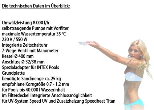 Leistungsstarke Sandfilteranlage Mithilfe integrierter Zeitschaltuhr unter anderem 7-Chancen-Absperrvorrichtung statt dessen jedweder Schwimmbadtypen solange bis 40.000 l Wasserinhalt