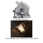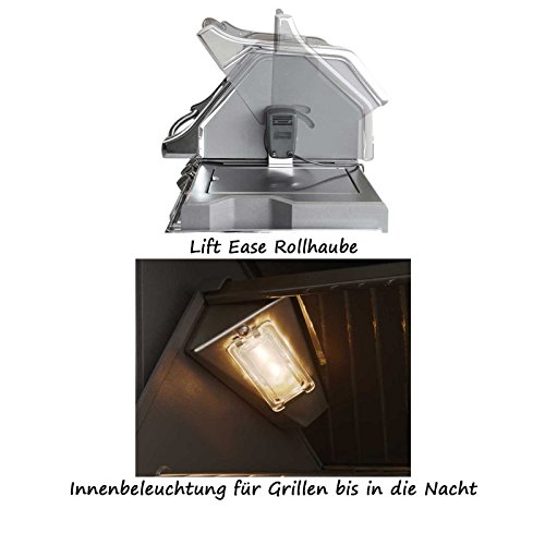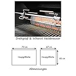 Beleuchtung: leuchtende NIGHT LIGHTTM Drehregler und Innenbeleuchtung – Infrarot-Heckbrenner für Gerichte vom Drehspieß – Der Gasgrill wird montiert geliefert – Dimension bei geschlossenem Deckel ohne Drehspieß: B 140 cm x T 65 cm x H 65 cm – Maße der Einbauöffnung in feuerfestes Material: Breite: 140 cm – Schlund: 53 cm – Höhe: 22,5 cm – Wandabstand: 5 cm