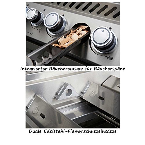 Stellen Sie sich vor, Sie vervollkommnen Ihre Outdoorküche mit dem perfekten Grillaufsatz: dem BIPRO825 mit Infrarot-Heckbrenner. Dieser Einbaugrillaufsatz bietet was auch immer, was Sie für professionelles Grillen benötigen: zwei getrennte Grillbereiche, Drehspieß-Vorrichtung und die spezielle SIZZLE ZONETM Area mit Temperaturen von bis zu 980°C für perfekte Steaks. Insgesamt finden rund 50 Burger Platz am WAVETM-Grillrost. Zusätzlich bieten die Warmhalteroste entlang der beiden Grillflächen Platz für zusätzliches Grillgut. Geflügel oder ganze Braten gelingen am Drehspieß dank des Infrarot-Heckbrenners enorm zart und knusprig. Noch immer nicht genug? Der BIPRO825 besitzt alias einen Räuchereinsatz mit einem eigenem Brenner. Einfach Lieblings-Räucherchips einfüllen und doch strömt ein unvergleichliches Aroma durch die Nachbarschaft. Die komplette Edelstahl-Ausstattung garantiert Langlebigkeit und Leistung. Chrom-Akzente verleihen dem Grill einen Funken Luxus, sodass Sie immer wissen: dieser Grill ist ein PRO.
