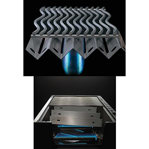 Premium-Edelstahl Konstruktion – SIZZLE ZONETM mit zwei Infrarotbrennern für saftige Steaks und einem dazwischenliegenden Edelstahl-Rohrbrenner zum Warmhalten des Grillguts – Vier Edelstahl-Hauptbrenner und ein integrierter, einfach auszieh- und nachfüllbarer Räucher-Einsatz, befeuert vom darunterliegenden Rohrbrenner – LIFT EASETM Rollhaube – WAVETM Edelstahl-Stabgrillroste – Edelstahlbrenner – Flammenschutzeinsätze und Grillroste
