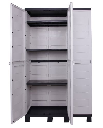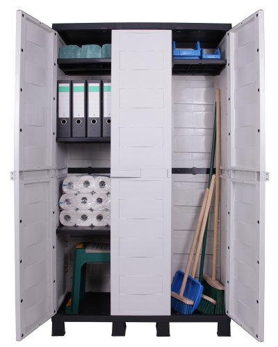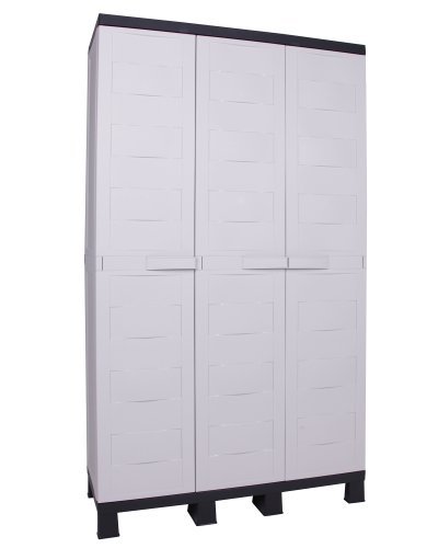 Dieser dreitüriger Universalschrank hat drei großen Türen, welche sich bis 180° öffnen lassen. Seine braun designten Fronten, mit den markanten hellgrauen Korpus wirkt dieser Schrank sehr modern. Die Füße sorgen für ausreichend Bodenabstand, womit sich der Schrank für Feuchträume, Balkone und überdachte Terrassen eignet. Der Korpus mit den markanten, ergonomiesch geformten Griffen, sind Design 2012. Diesen Schrank gibt es auch in den klassischen Farben beige – braun und hellblau – anthrazit auch als Universalspindschrank mit vier Böden und als zweitürigen Schrank mit drei Böden. Die gute Verarbeitungsqualität mit den drei bis zu je 15 kg belastbaren Böden haben einen passgenauen Sitz. Ein verrutschen oder abkippen der Böden ist unmöglich und bietet erhöhte Sicherheit des gelagerten Gutes. Durch das Befüllen des Schrankes erhält dieser zusätzliche Stabilität. Der Schrank besteht aus hochwertigem Kunststoff, ist UV-beständig, witterungsbeständig und die Kunststoff-Einlegeböden sind in ihrer Höhe verstellbar. Die Maße des Schrankes sind 96 (B)x 37 (T) x 173 (H) cm, das Gewicht beträgt 15 KG. Hergestellt und designt ist der Schrank in Italien. Der Schrank lässt sich ohne Werkzeug in ca. 10 bis 15 Minuten von einem ungeübten Heimwerker zusammenbauen. Beim Zusammenbau sollte man einfach nach der logisch und simpel aufgebauten Anleitung vorgehen. Diese liegt im Schrank bei. Die Teile sind so gearbeitet, dass ein falsches Zusammenbauen eigentlich nicht möglich ist. Die Reinigung ist einfach mit einem Neutralreiniger oder Alkoholreiniger durchzuführen. Geeignete Reiniger (FINALIT) finden Sie u. a. auch in unserem Shop, aber auch andere handelsübliche Reiniger sind durchaus gut geeignet.