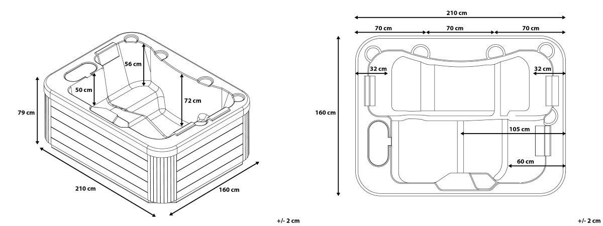 Maße: 210 x 160 x 79 cm, Leergewicht: 270 kg, Abenteuer: 220 – 240V / 50Hz, Wassermenge: maximal 930 Liter, hochwertige Kunststoffverkleidung in Holzoptik (wartungsfrei + farbstabil)