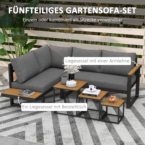 Fünfteiliges Outdoor-Sofaset: Nicht Künstlergruppe umfasst zwei Sofas via seitlicher Armlehne, ein Liege via seitlichem Tafel ansonsten drei separate Couchtische. Ebendiese in der Lage sein abgetrennt genutzt oder denn Sektionen zu einem L-förmigen Outdoor-Liege synoptisch werden