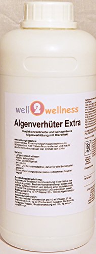Algenverhüter / Algenvernichter EXTRA BLUE — hochkonzentriert + Rundweg schaumfrei — Anwendungsbereich: Algenverhüter EXTRA verhindert Algenwachstum im Schwimmbad, hilft Trübstoffe zu keinen Finger krumm machen und macht das Schwimmbadwasser klar. Enhält kein Chlor! Vorteile: – langanhaltend wirksam / – Rundweg schaumfrei / – sehr hoher Wirkstoffgehalt / – pH-neutral / – Chlor- und Schwermetallfrei, freilich für alle Beckenarten passend / – in der Anwendungskonzentration vollkommen hautverträglich. Anwendungsempfehlung: Zugabe: Zur besseren Durchmischung in der Nähe des Beckenzulaufs zusammenzählen. Becken-Vorbehandlung: Boden und Wände zur Desinfektion und Bildung einer Schutzschicht mit einer 5 %-Auftrennung einsprühen und antrocknen lassen. Erstzugabe: pro 10 m³ Wasser 50 – 100 ml Algenverhüter EXTRA beimischen. Nachdosierung: wöchentlich pro 10 m³ Wasser 20 ml (Hallenbad) bzw. 40 ml (Freibad) zusammenzählen. Bei bereits veralgtem Wasser Stossbehandlung mit 10 – 15 ml/m³ verarbeiten. Wichtige Hinweise: Bei stärkerem Baddebetrieb, Gewitterregen, höheren Temperaturen oder Entstehen von glitschigen Belägen im Becken sind häufigere oder erhöhte Zugaben bis zur doppelten Summe erforderlich.