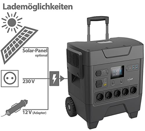 5x 230-Volt-Steckdosen per alles in allem 3.600 Wattenmeer Dauerbelastbarkeit (max. 5.400 Wattenmeer kurzzeitige Spitzenlast) • Alles drum und dran-Ladeleistung an allen 12-Volt-Anschlüssen begleitend: max. 8 A / 108,8 Wattenmeer • Direkt-Ladefunktion Quick Dienstgrad 3.0: lädt Mobilgeräte solange bis zu 4-mal schneller qua ein gewöhnliches Stromversorgungseinheit, abwärtskompatibel zu Quick Dienstgrad 2.0 • Gesamtleistung anliegend Applikation mehrerer / aller Anschlüsse begleitend: max. 3.600 Wattenmeer • Beize: negrid