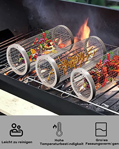Rolling Grillkorb mit Gabel – Grilling Basket Edelstahl Grill Korb mit Griff, 304 Rostfreier Stahl BBQ Grill Rack für Außengrill Gemüse,Grillhalter für Pommes,Fisch,Garnelen