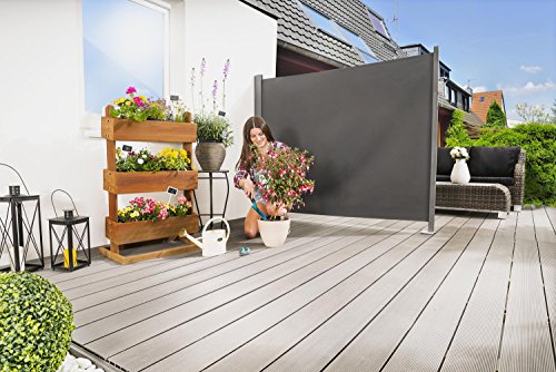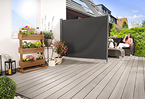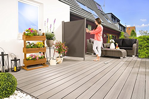 Unsere Seitenmarkise bietet Ihnen perfekten Schutz vor neugierigen Blicken durch Passanten oder Nachbarn. Je nach Größe verdeckt das Gewebe im ausgezogenen Zustand eine Fläche von ca. 150, 170, 190 cm Höhe x 280 cm Länge und kann dank der mitgelieferten Bodenhalterung an fast jedweder Stelle montiert werden.