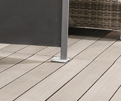 Die Seitenmarkise ist einfach montiert, als dank der mitgelieferten Bodenplatte kann die Seitenmarkise auf fast allen Untergründen arretiert werden – dazu einfach die Bodenplatte an der gewünschten Stelle montieren – fertig. Leichte Sturz an Terrassen oder Balkonen von ca. 1,5 cm können dank des integrierten Neigungswinkelausgleichs klug werden.